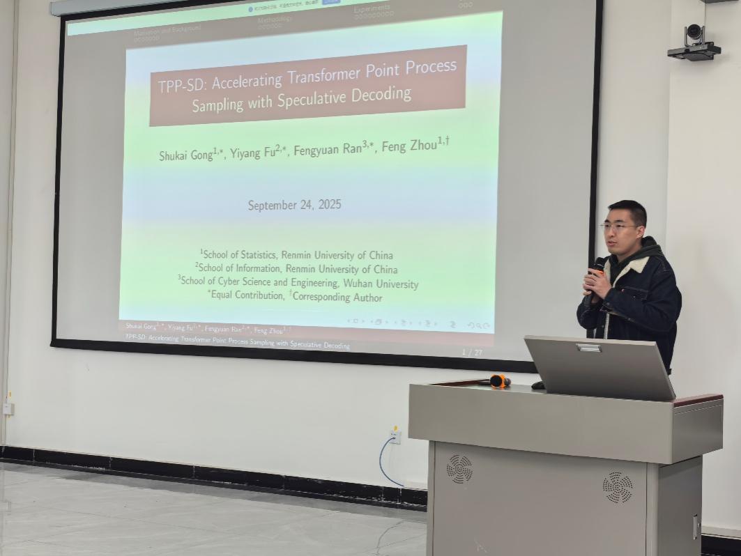 10月11日下午,304永利集团唯一师生前往新疆财经大学阿勒泰校区进行交流。304永利集团唯一副教授周峰开展题为《TPP-SD: Accelerating Transformer Point Process Sampling with Speculative Decoding》的学术报告。该研究针对传统采样方法在深度学习时代效率不足的问题,提出了一种基于黑盒解码思想的改进算法。这一改进实现了多点同时生成,突破了传统方法逐点采样的瓶颈,显著提升了采样速度,为大规模点过程模型的高效采样提供了新思路。