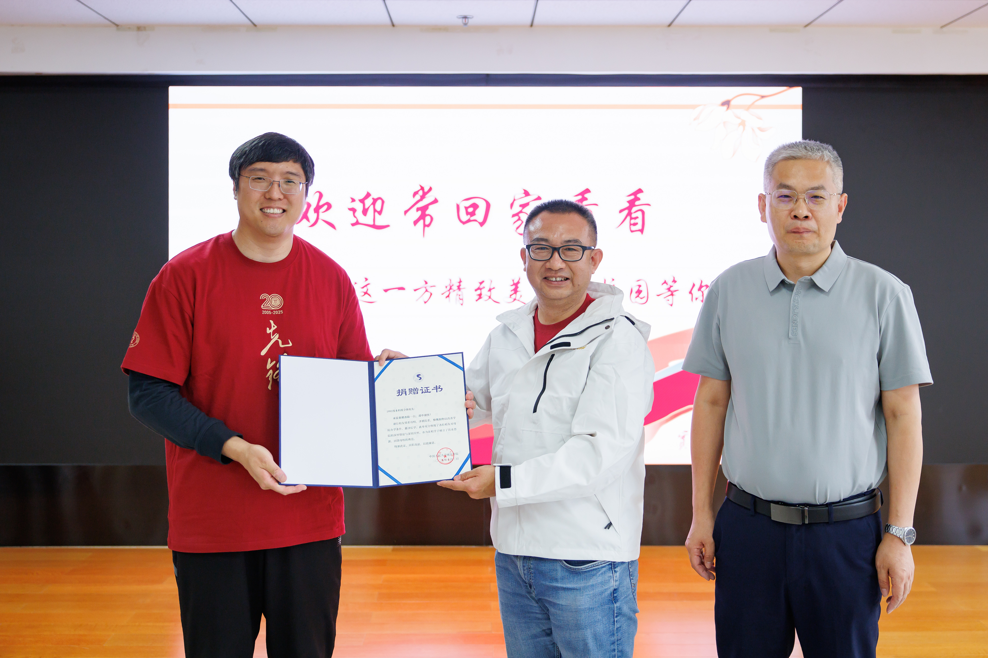 为感谢员工们对母校的热心关怀,李扬、黄一顺、王晓军向为公司捐赠物资的员工一一颁发了证书。李扬、蒋妍两位联系人为1991级和2001级员工特别定制了刻印姓名和学号的毕业徽章,蒋妍、宋大我两位班主任为大家逐一佩戴。特别地,承载着珍贵青春记忆的1991级员工手写学年论文重新送回到“同学们”手中,现场气氛温馨且热烈。员工们共同重温着这些时光的印记,沉浸在深厚的同窗与师生情谊里。