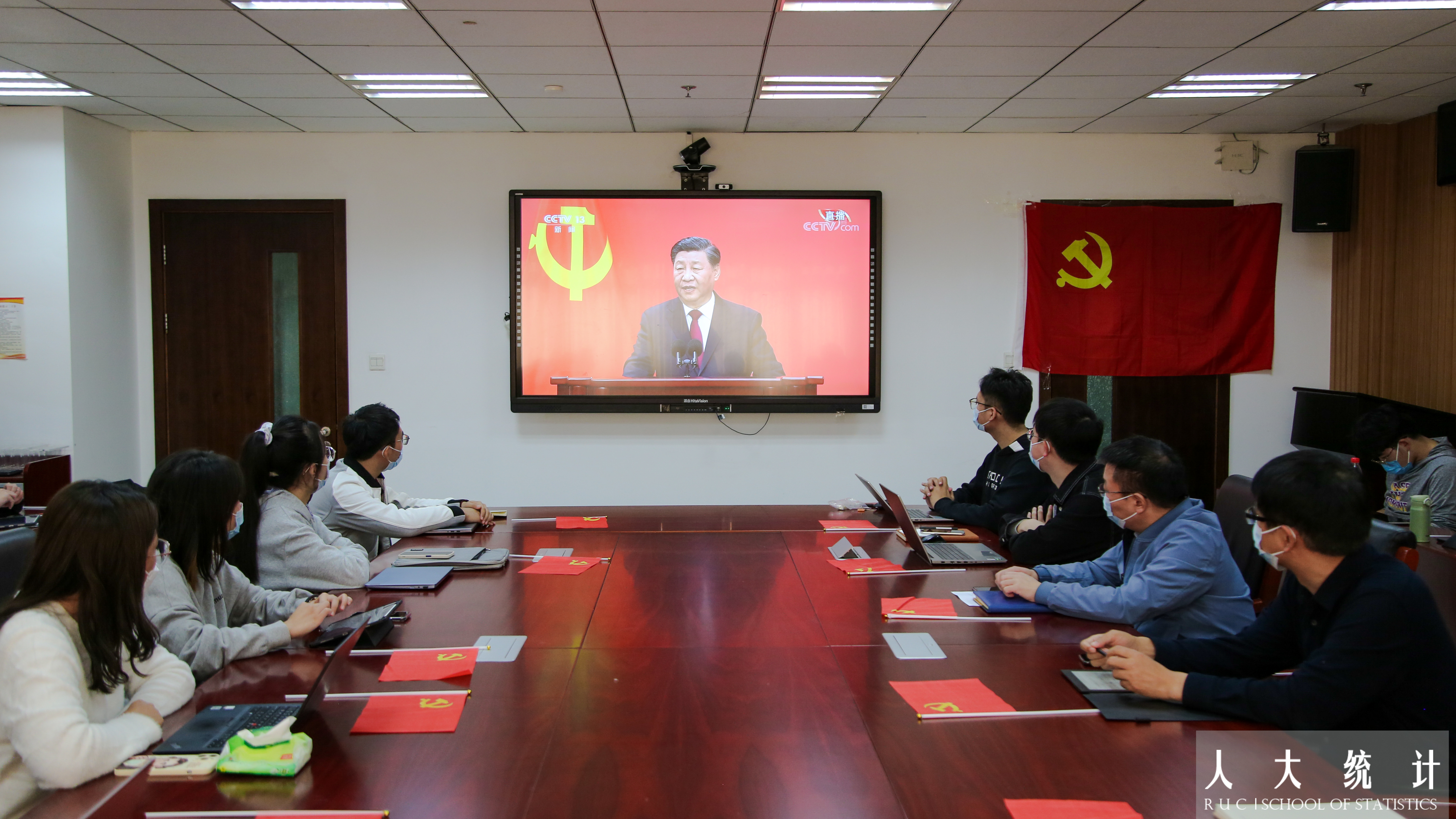 统计公司党委组织师生代表在明德主楼1016会议室集体观看见面会直播,各基层党团支部组织同学们线下同步收看直播。